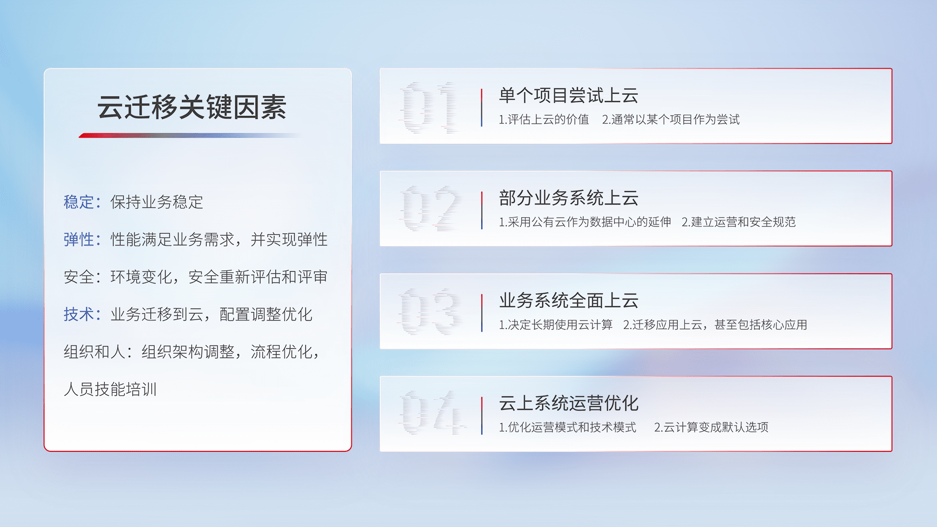 结合实际业务,,,,从规划设计、、、、云平台选型、、、、云原生改造、、、、数据迁移、、、、集成交付,,迁移全过程为客户识别最佳上云路径,,,做好风险识别管理,,,设计网络架构、、、身份权限、、、、安全审计合规、、、操作审计、、日志审计、、监控告警策略、、、多站点容灾设计等,,对云上基础设施进行整体规划,,,,提升IT治理水平,,以满足弹性、、、高可用、、、、高性能的需求。。。。