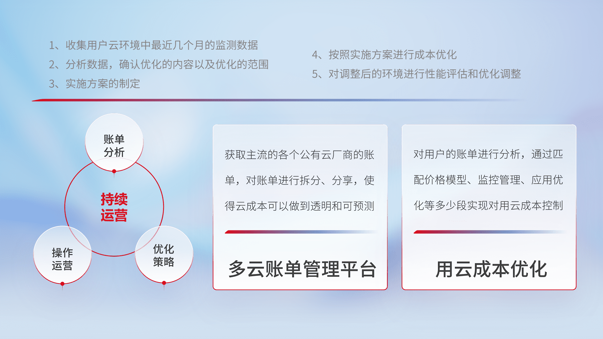 通过多云纳管,,以统一的资源数据模型把客户的云资源进行抽象和封装,,,进而实现对多云资源的统一操作,,,保障云资源管理的可靠性、、、、稳定性与可用性。。。量身定制化运维内容,,,,配置、、、、开发运维、、补丁管理、、备份、、、、监控、、、认证和访问管理、、、、审计和日常巡检等,,,,保障在用云过程中的可靠度,,,稳定度以及高可用率。。。